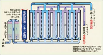 還元水側は、電気分解によって水酸化イオン(OH-)や陽イオン(カルシウムイオンなど)が多くなり、同時に水素が含まれることになります。
