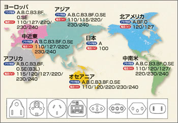 左記の図のとおり場所が変われば、電源の電圧やプラグの形状が変わります。そこで、世界中で使用できるフリー電源入力に対応しました。(付属の電源コードは使用国によって異なります)